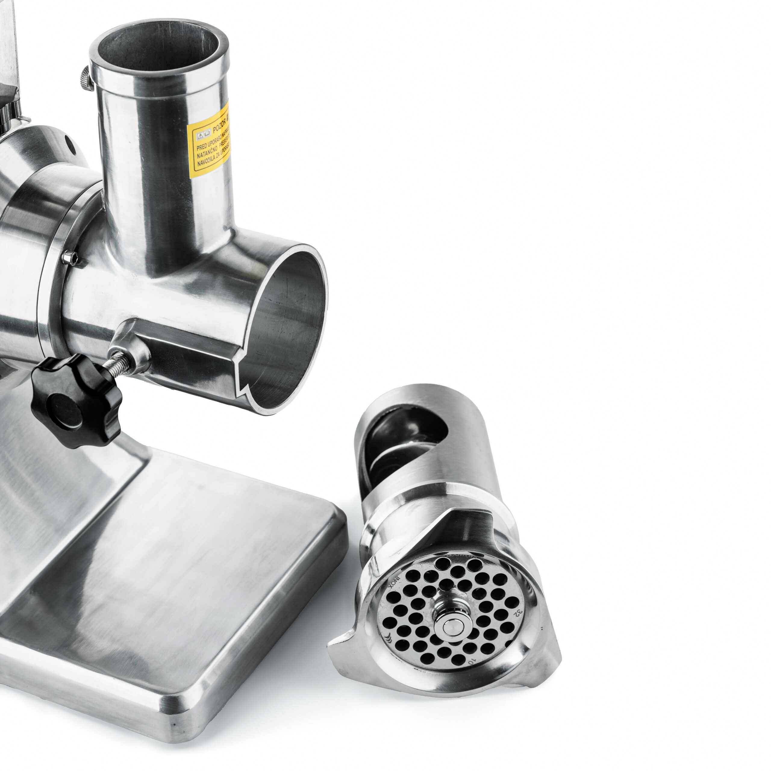 Robustna zasnova, samo‑ostrilni rezalni elementi in enostavno razstavljanje zagotavljajo dolgo življenjsko dobo, visoko higieno in preprosto čiščenje. Velik polž velikosti 32 omogoča hitro obdelavo tudi večjih kosov mesa, funkcija vzvratnega vrtenja pa olajša sproščanje zataknjenega mesa.